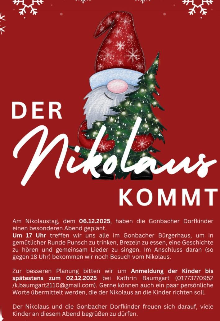Besuchen Sie das traditionelle Haxenessen des Jugend- und Freizeitclubs am Samstag, 29. November ab 11 Uhr, seien Sie dabei wenn der Nikolaus am Samstag, 06. Dezember ab 17 Uhr zu den Dorfkindern
